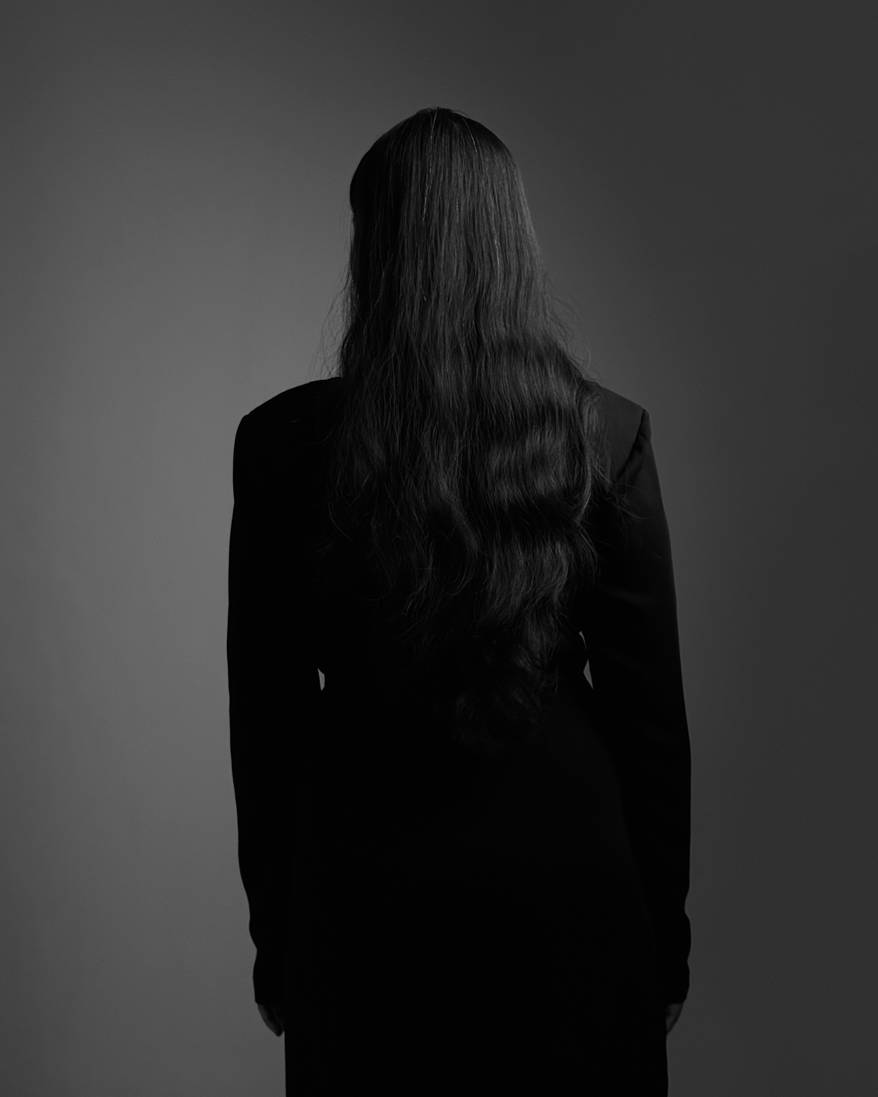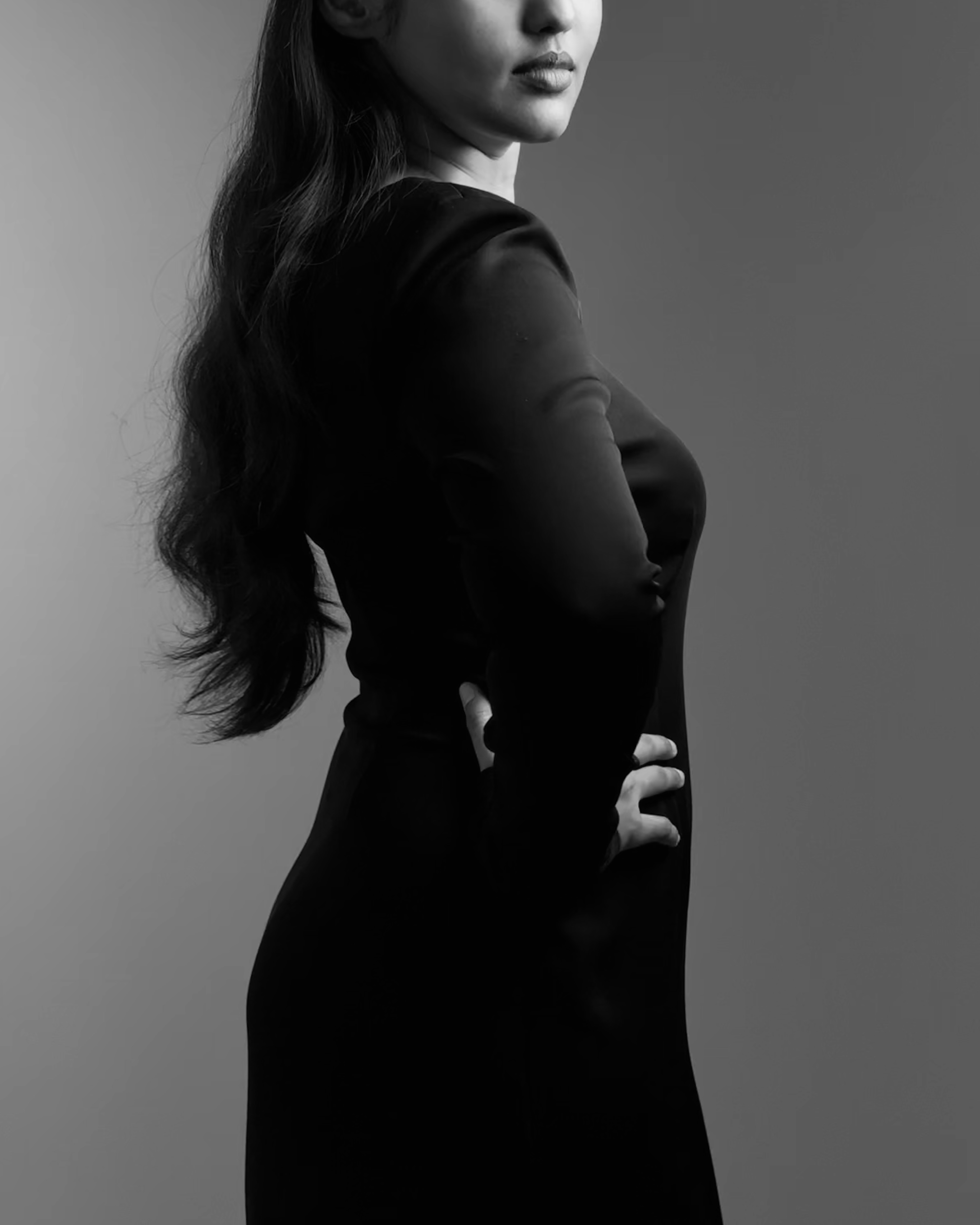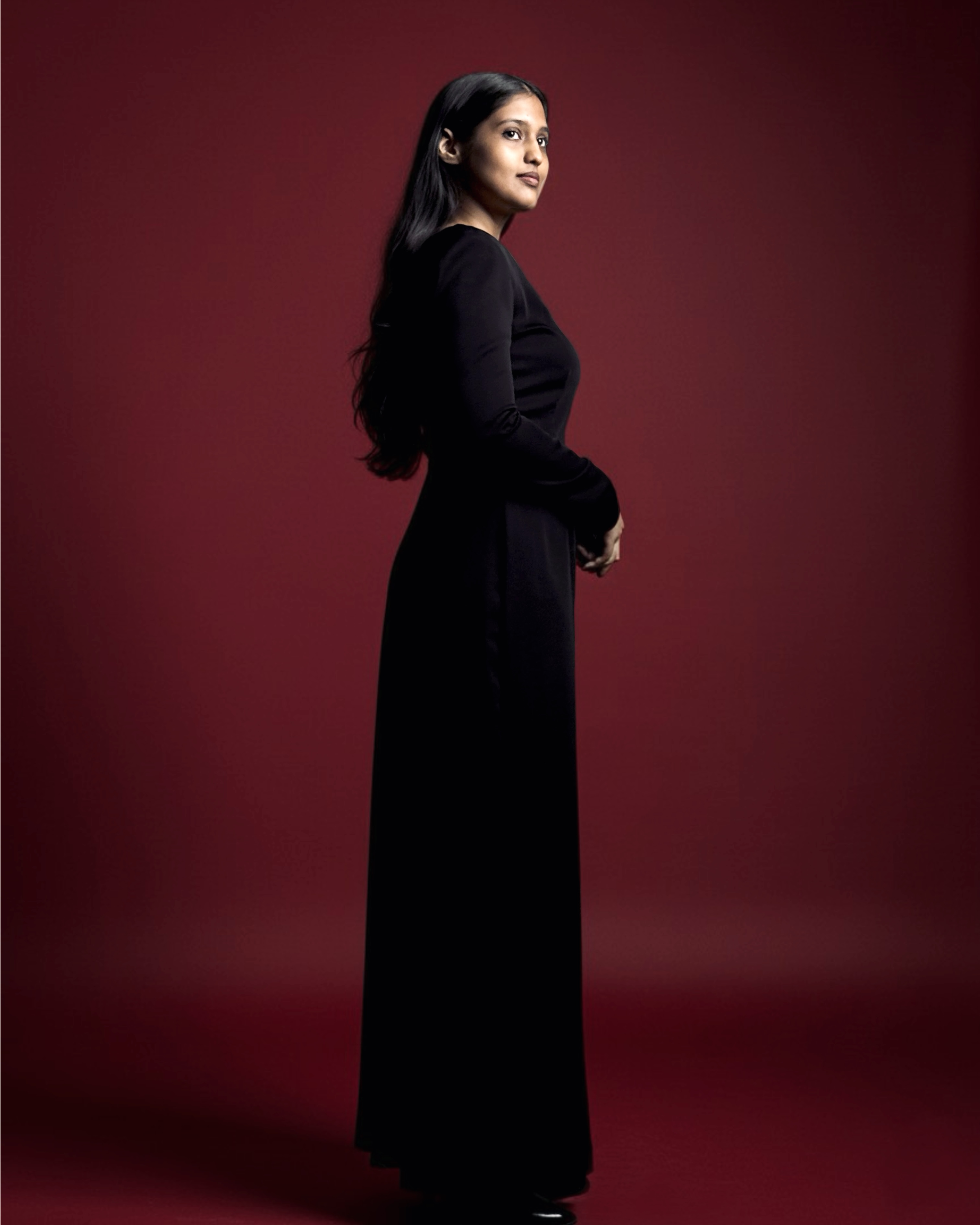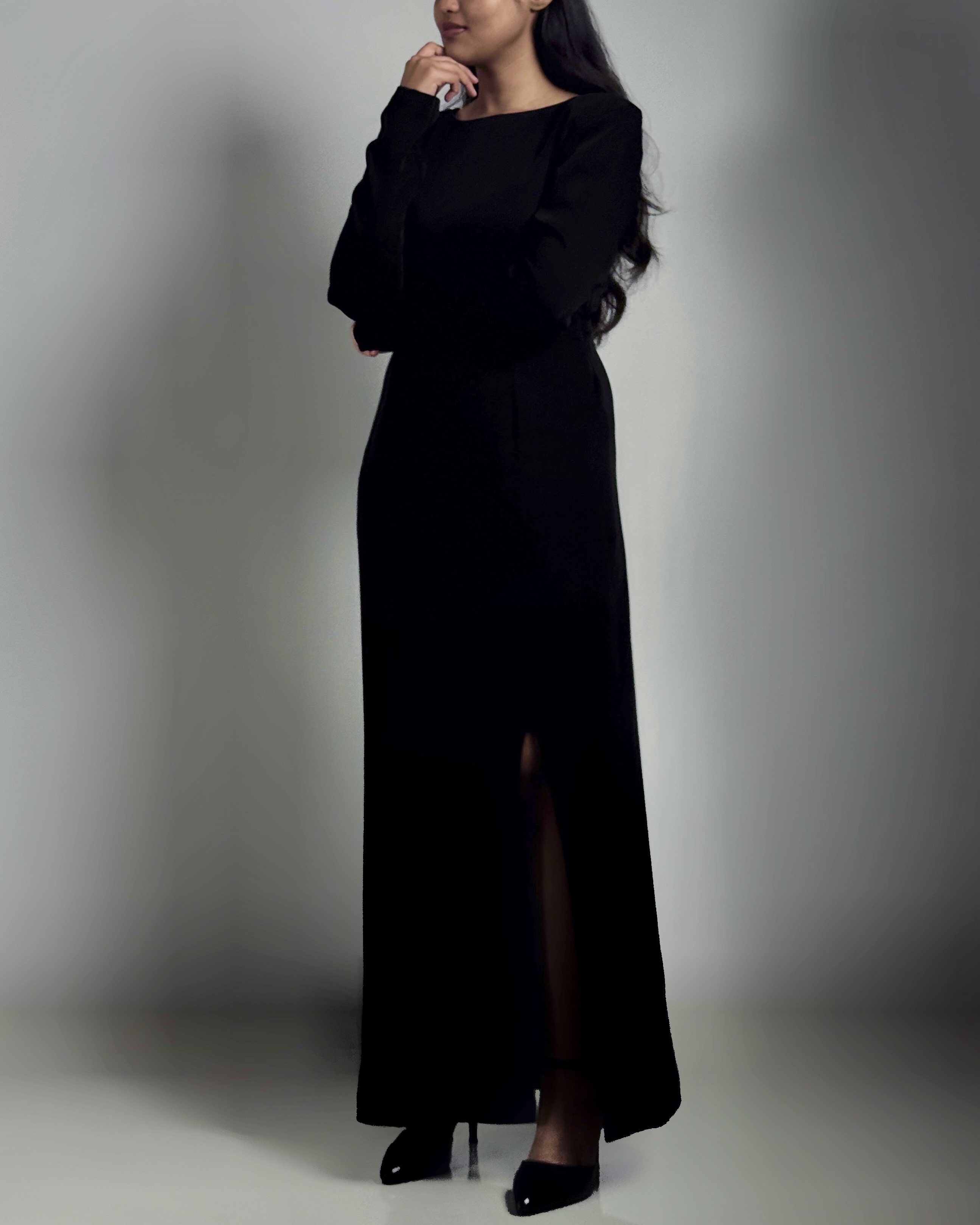 Full-length black gown with structured shoulders, round neckline, long fitted sleeves, tailored waist, and knee-high front slit. Handcrafted from suiting fabric.