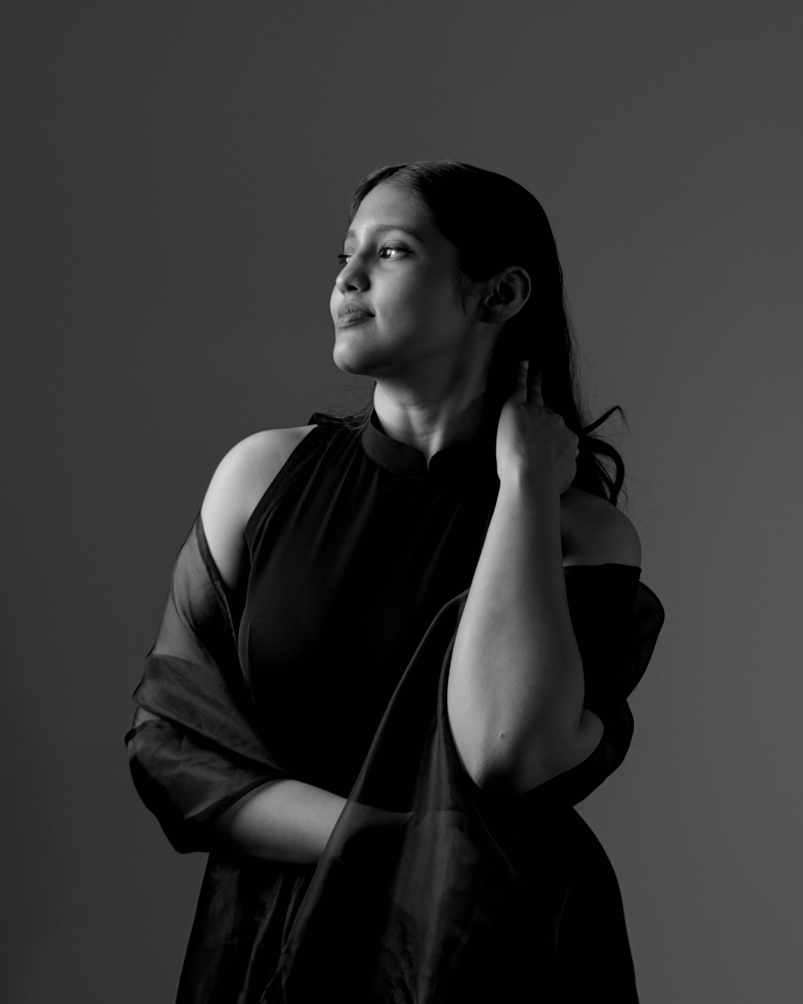 Full-length black gown with standing collar, sleeveless design, tailored waist, and knee-high front slit. Handcrafted from suiting fabric.