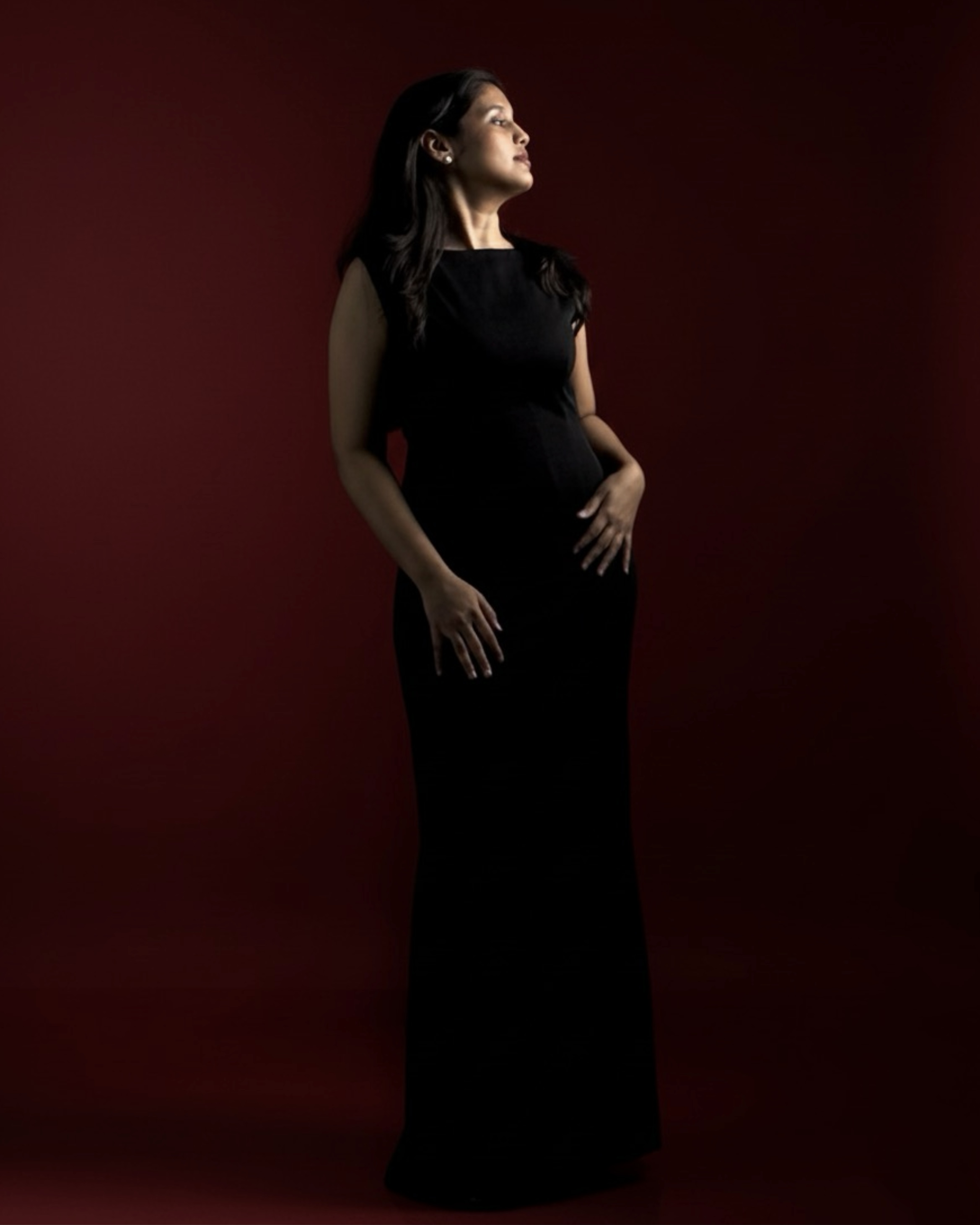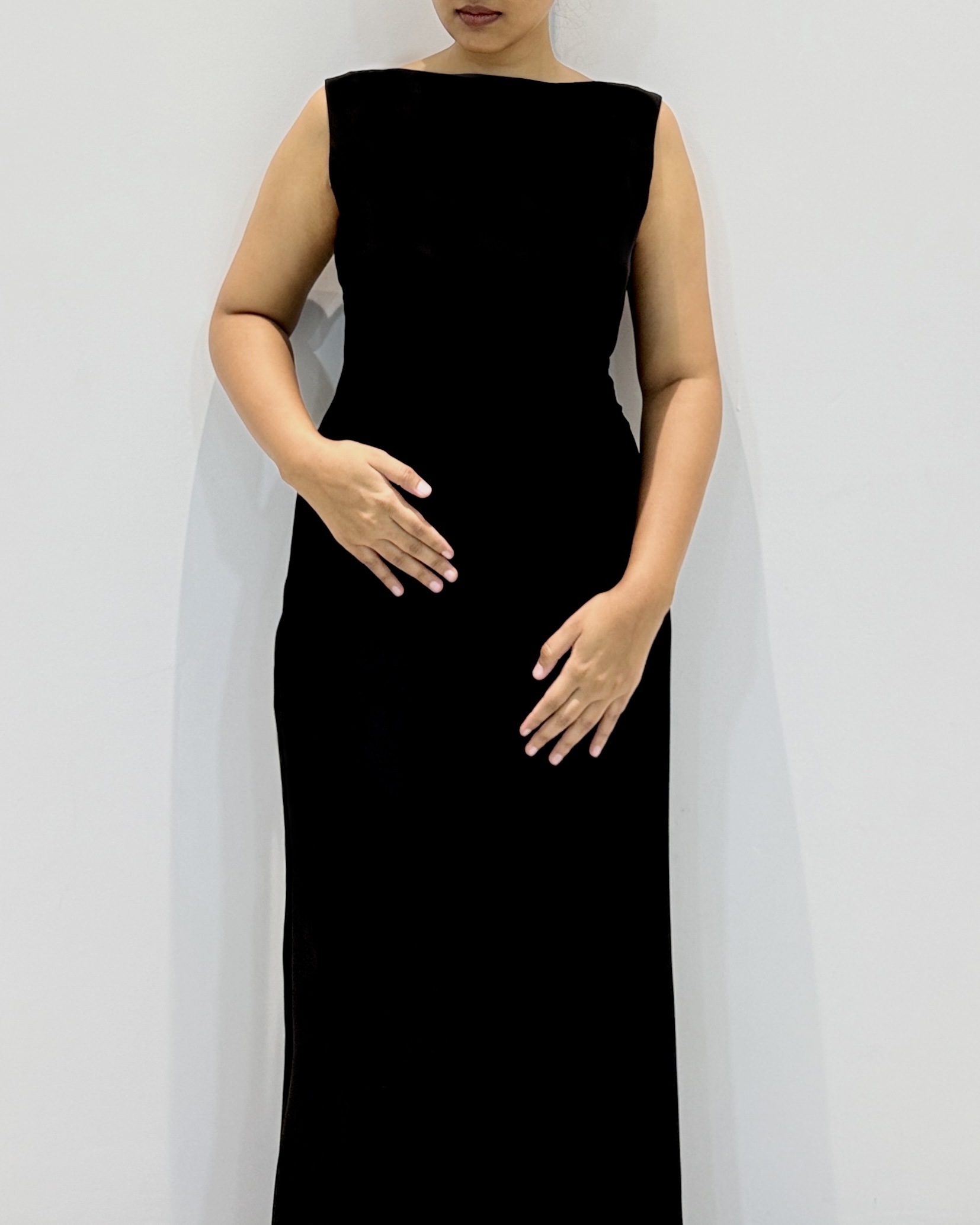 Full-length black gown with a bateau neckline, sleeveless design, and tailored waist. Handcrafted from suiting fabric.