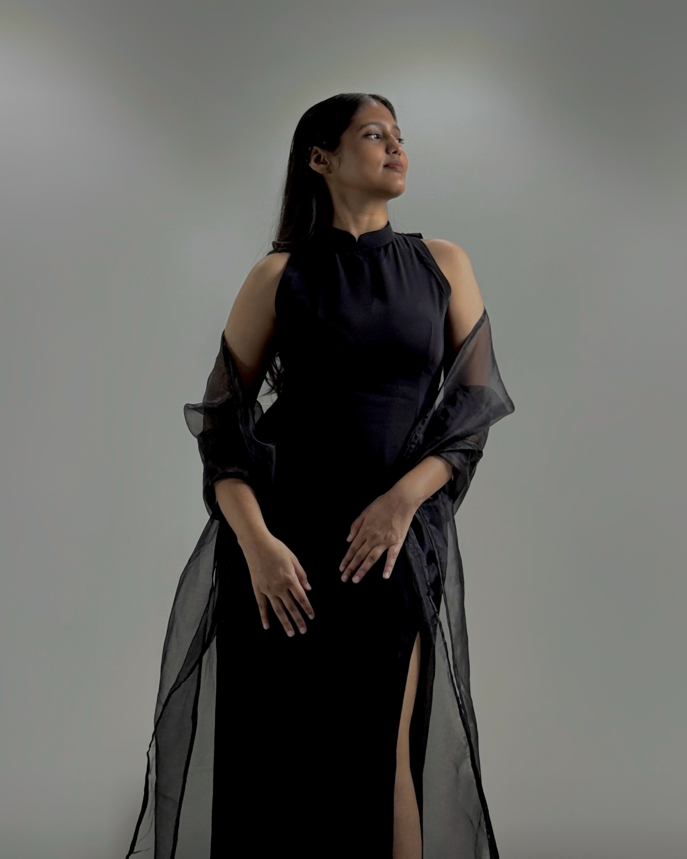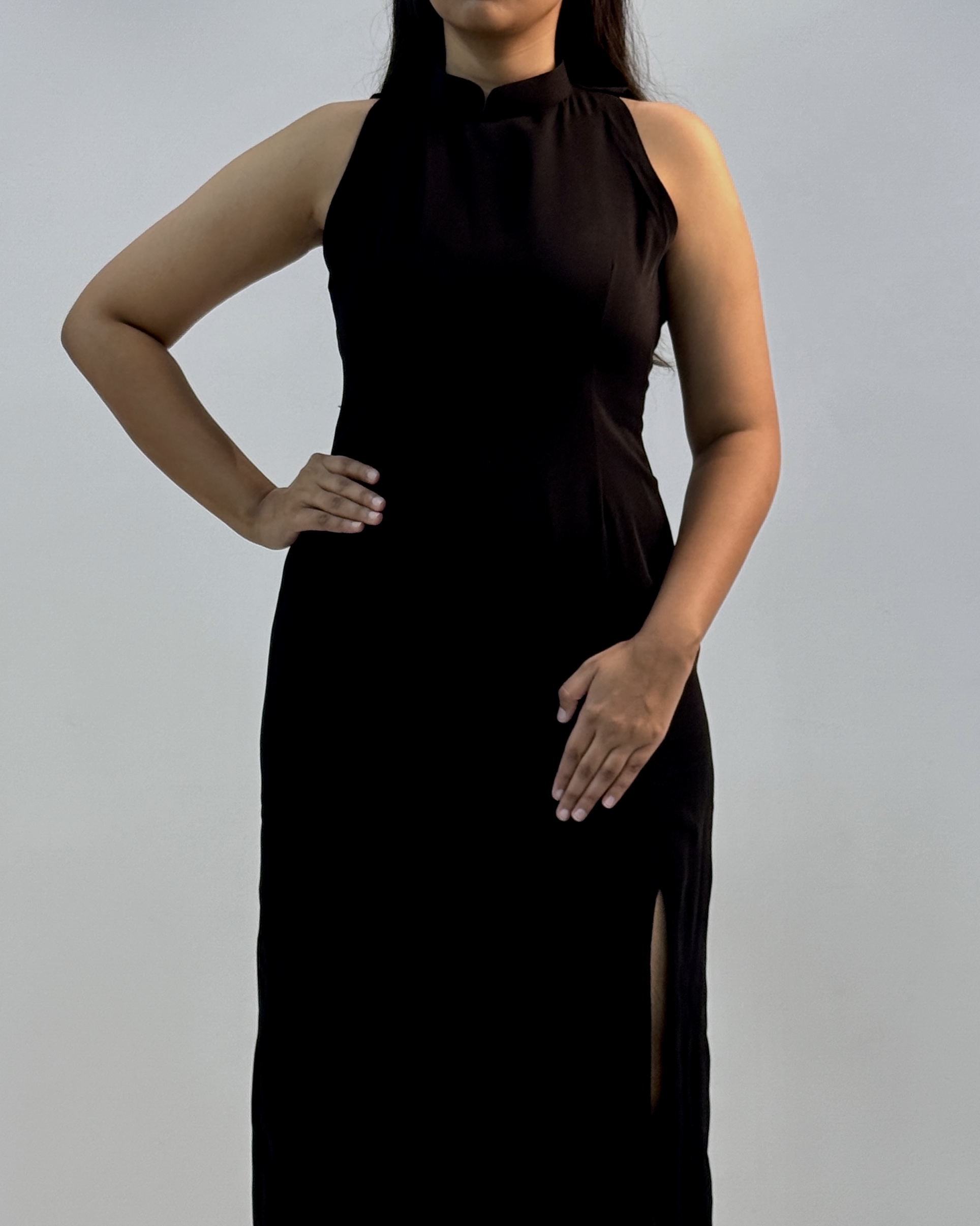 Full-length black gown with standing collar, sleeveless design, tailored waist, and knee-high front slit. Handcrafted from suiting fabric.