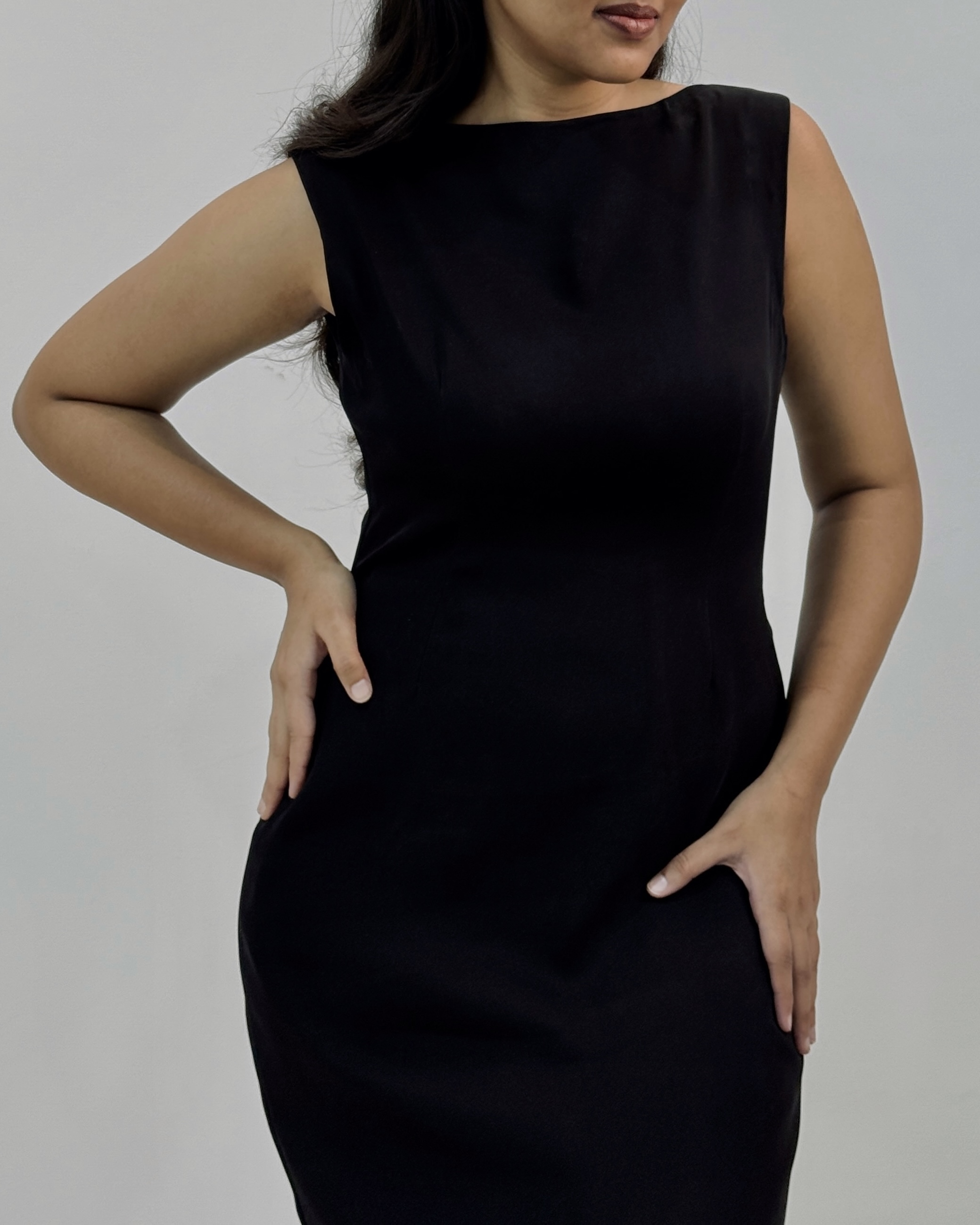 Full-length black gown with a bateau neckline, sleeveless design, and tailored waist. Handcrafted from suiting fabric.